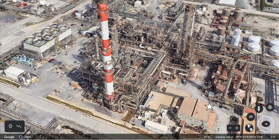 My job was at the facility that made acrylonitrile, a monomer used in the manufacture of plastics (acrylonitrile is the "A" in ABS resin, which is what Lego bricks are made of). I didn't turn valves or anything, but I was right there, adjacent to the ammoxidation infrastructure - in this current-day Google Earth image, my former office is at lower right, marked with a white star. The big red and white column in the foreground is new; it wasn't there during my time at the plant.
