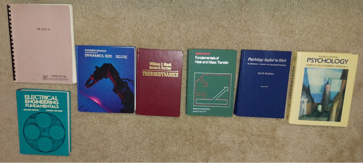 My books for Electric Circuits, Dynamics I, Thermodynamics I, Heat Transfer, Industrial Psychology, and Psychology II. I got a C in Thermo (the only Georgia Tech class I failed to get an A or a B in).