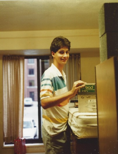 Here I am, moving in at the start of the quarter. Unlike in Smith (beds on the floor) and Brown (bunk beds), in Harrison the beds were elevated but separate. My roommate John (a different John than freshman year) was away most weekends, which gave me some alone time to pursue creative outlets. Once, I was positioned just as in the photo, unwisely using my bed as a workspace to mix Jell-O. After accidentally spilling the solution onto my bed, I flipped over the mattress and didn't tell anybody about my mishap. Two years later, I was coincidentally assigned this room again. I peeked at the underside of the mattress, and it was STILL WET! Ewwwww.