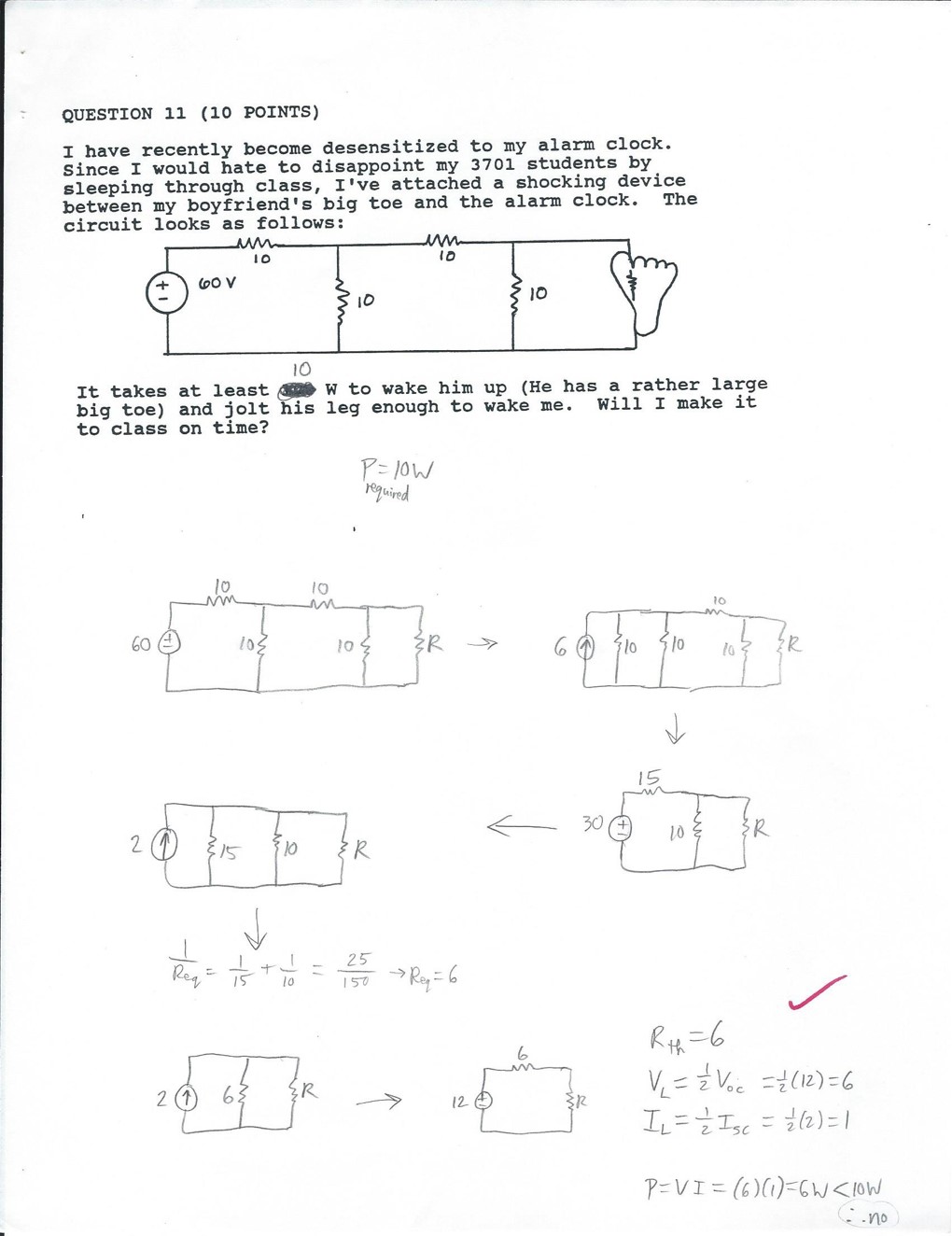 My aforementioned 8am class was Electric Circuits; the instructor was a novelty for Georgia Tech: an attractive blonde coed graduate student. Like its student body, Tech's faculty was overwhelmingly male - though I took dozens of undergraduate classes, I can count on one hand the number of female teachers I had. To be honest, Tech's culture (during my time there, anyway) had a strain of dysfunctional gender relations - there were some incel vibes about, exemplified by a male-penned editorial in the school newspaper that whined about "Tech Bitch Syndrome." Referencing her boyfriend in this test question was the instructor's attempt to discourage unwanted attention from amorous students, I presume.