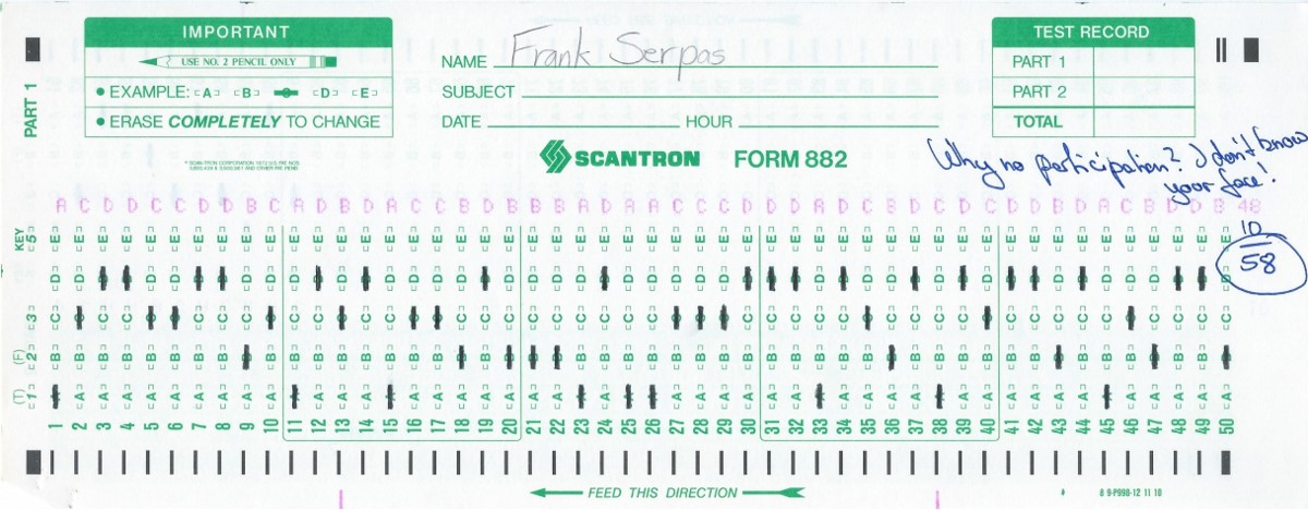 Psychology II was another of the rare woman-taught courses that I took. In advance of this write-up I tried to summon a mental image of the instructor, but couldn't do so, which led me to LOL when I pulled out the folder for the class and found this Scantron form, annotated with "Why no participation? I don't know your face!" - apparently the prosopagnosia was mutual! Throughout my college experience, I rarely spoke in class, and never went to office hours - I was content to remain anonymous and (per this example) get 58 out of 60 questions correct on a test. That's characteristic behavior for me - I'm not sure what it says about my personal psychology.