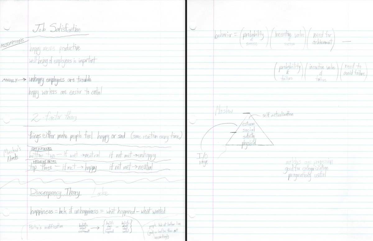I enjoyed the psychology classes I took; to this day I won't pass up an opportunity to drop "Maslow's Hierarchy of Needs" into a conversation. The attached image is of a couple of pages of notes I took in the Industrial Psychology class; I ended up getting a certificate (kind of like a minor) in that field. The strongest memory I have of the course, however, is of the bizarre way the prof (a fairly young guy, with a casual demeanor) dismissed the class one day - with about 10 minutes to go before the lecture period was due to end, he said "I'm going to stop now, because I really have to take a shit" and abruptly left the room. I (and all the other students) froze in stunned silence before eventually leaving. I still don't know if this was an indiscreet admission of a physiological need, or an undisclosed psychology experiment (maybe he had a confederate in the room observing our responses?).