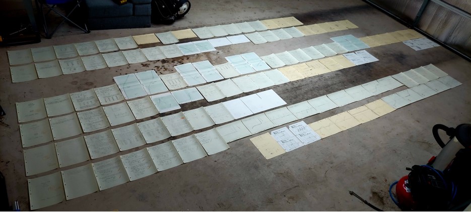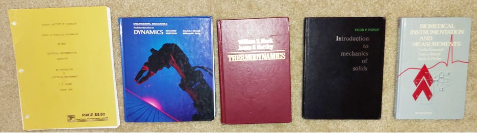 Here are three sheets of "engineering paper" I put to good use; each is positioned atop the folder pockets of their respective classes. Everybody referred to Mechanics of Deformable Bodies by its very rad nickname of "Def Bods" - we were allowed to bring one page of notes to the final exam; this is mine. In the middle is a homework problem for Dynamics II (I just now checked the answer in the back of the textbook to make sure I got it correct). Finally, a page of notes from Bioengineering Measurements, the first class I took toward earning a certificate in Bioengineering.