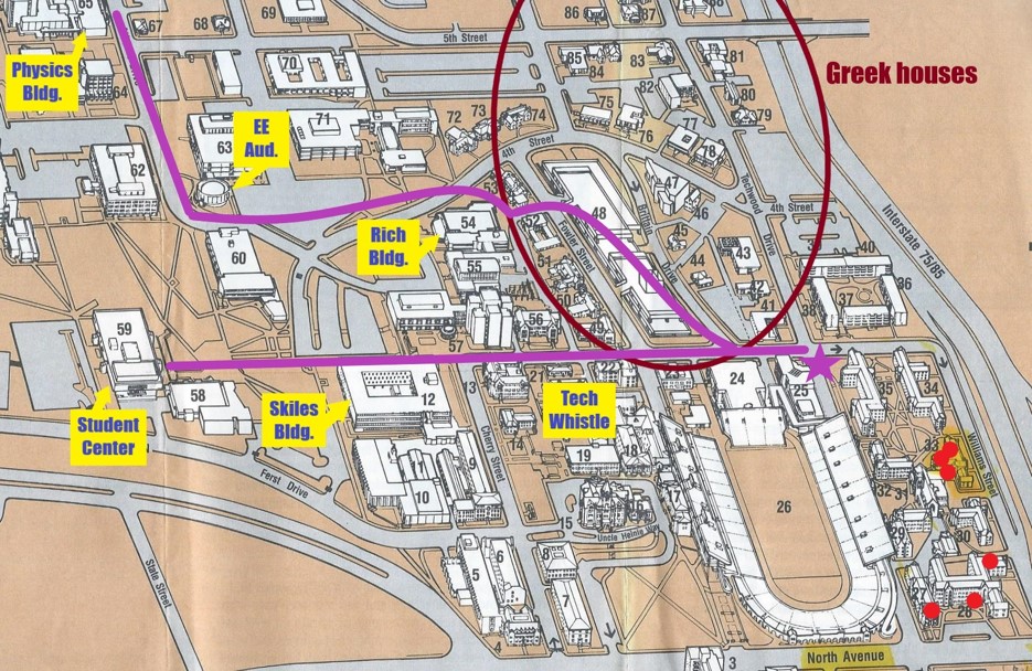 During my time at Tech, I primarily trod two paths from my various dorm rooms (red dots at lower right) into campus.
