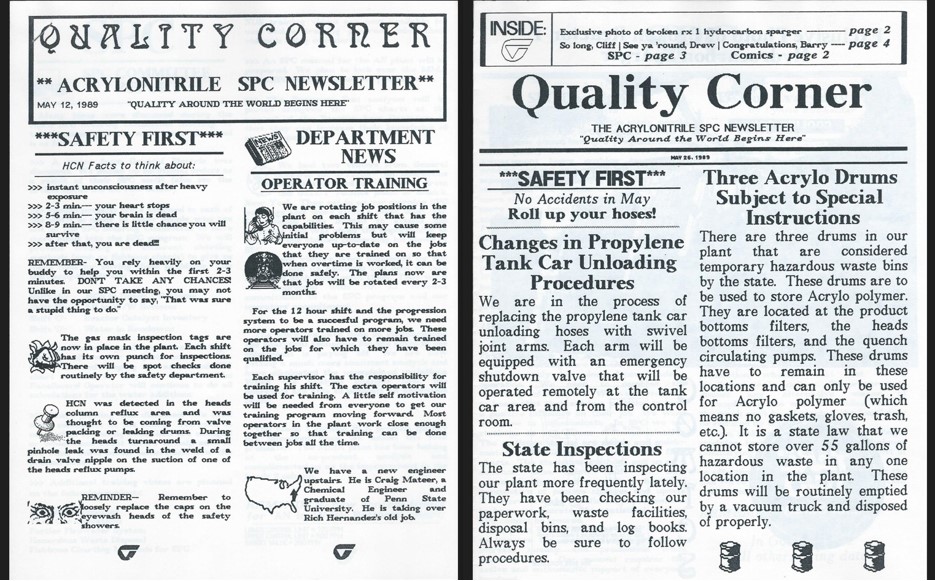 This was another co-op work quarter, so let's look at my favorite task at American Cyanamid: serving as editor of Quality Corner, the Acrylonitrile Plant's internal newsletter. It was published every other week and ranged from two to six photocopied 8.5"x11" pages, depending on how much news and SPC (Statistical Process Control) wisdom there was to convey.
