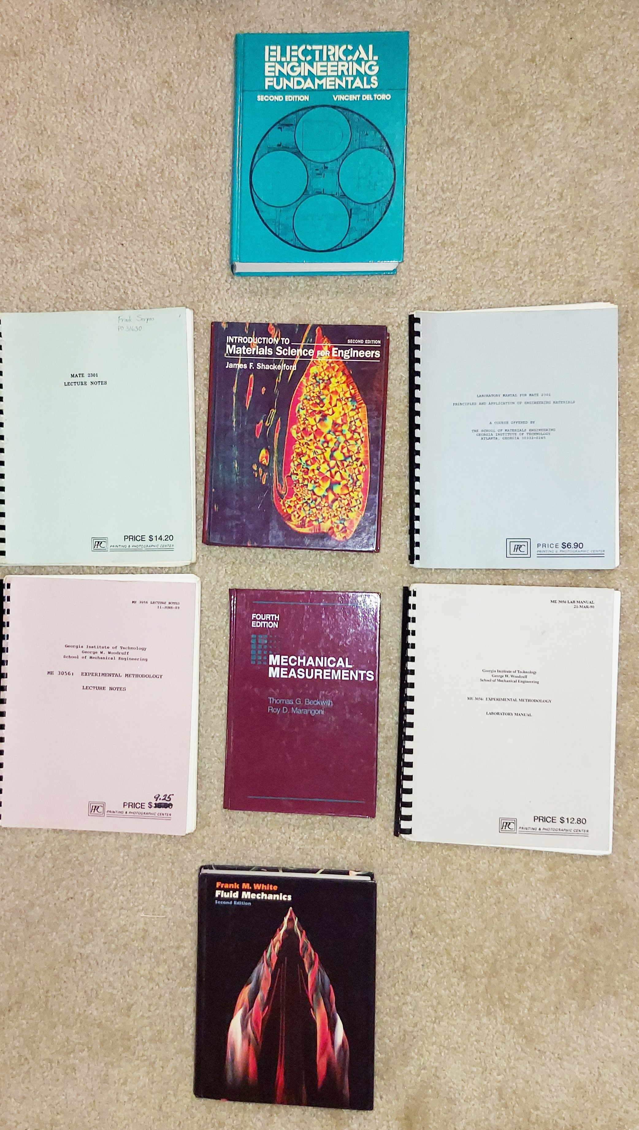 Academically, I was hitting on all cylinders - I pulled a 4.0 for the second (and last) time of my undergraduate career. One class had a single textbook (Fluid Mechanics I), two classes (Elementary Electronics, Electric Power Conversion) shared the same textbook, and two classes (Experimental Methodology, Principles & Applications Of Engineering Materials) each used a textbook + lecture notes supplement + lab manual. I took it as a good omen that my Materials lab partner was an Indian guy named Anil, pronounced the same as the verb "anneal" (to temper or toughen a material via heat treatment), which was a topic covered in the course. I remember that Fluids was the first class I took in a classroom that had a whiteboard instead of a chalkboard. I also remember that the teaching assistant for the class was a Big Deal - in the syllabus he was listed as the "Woodruff Doctoral Teaching Intern," and apparently he lived up to the hype: Googling indicates that he is now "The Bagrit and Royal Academy of Engineering Chair in Medical Device Design" at Imperial College London. His cool vibe made an impression on me - he would wield the dry-erase marker while wearing shorts and a Red Hot Chili Peppers t-shirt; when I later became a TA, I tried to emulate his approachability and friendly demeanor.