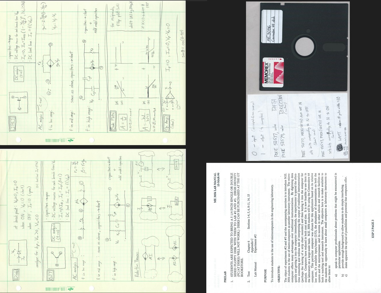 Below is my course summary for Elementary Electronics (which I was allowed to bring to the final exam) and the 5.25" floppy disk I used for the Experimental Methodology class, along with some programming notes and a quaint page from the lab manual about the virtues of digital. I guess analog circuits are still a thing, today?