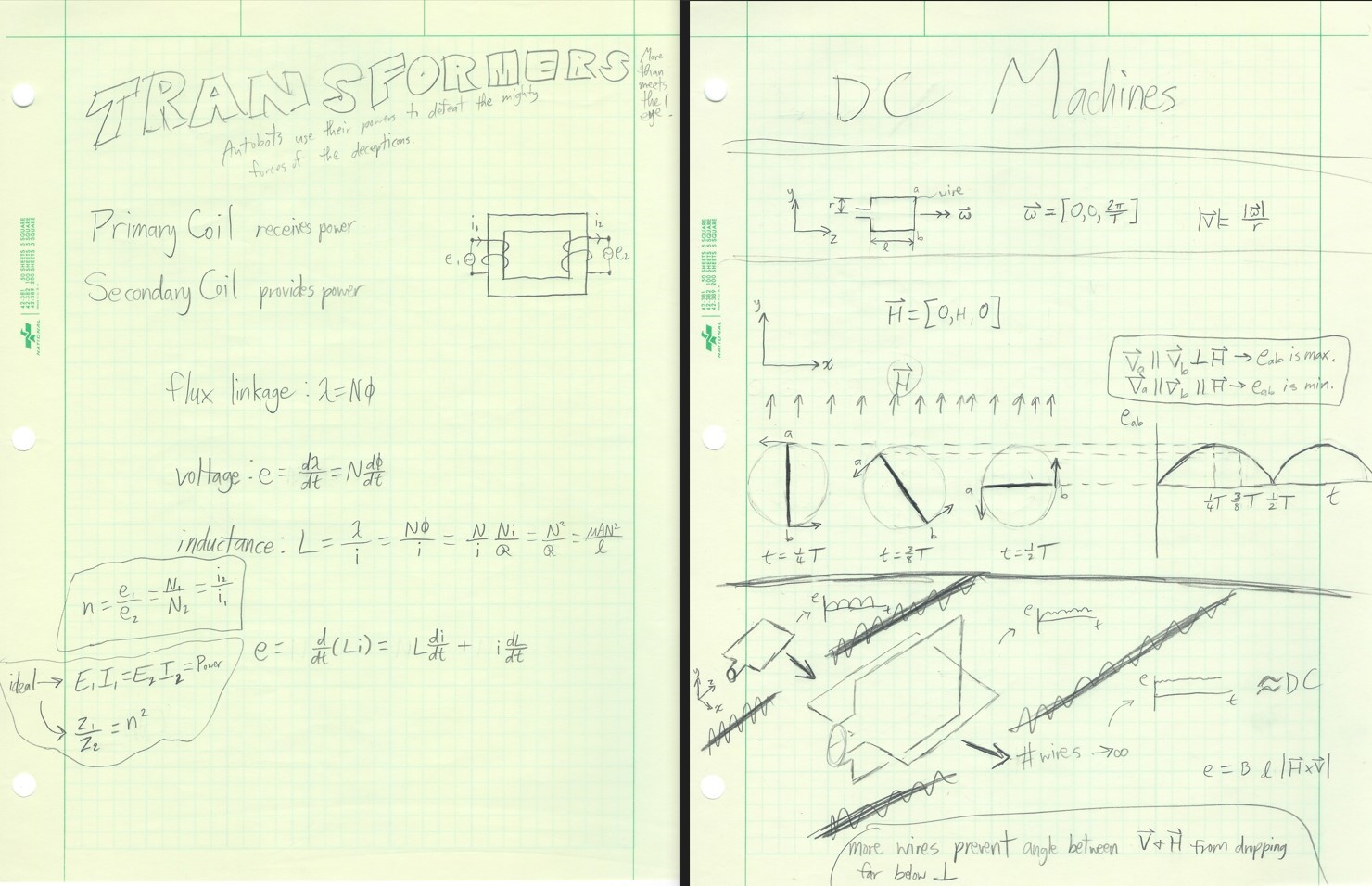 Here are a couple of pages of notes from my Electric Power Conversion class: an obligatory Hasbro reference, and an "aha moment" (no torque pun intended) about DC machines.