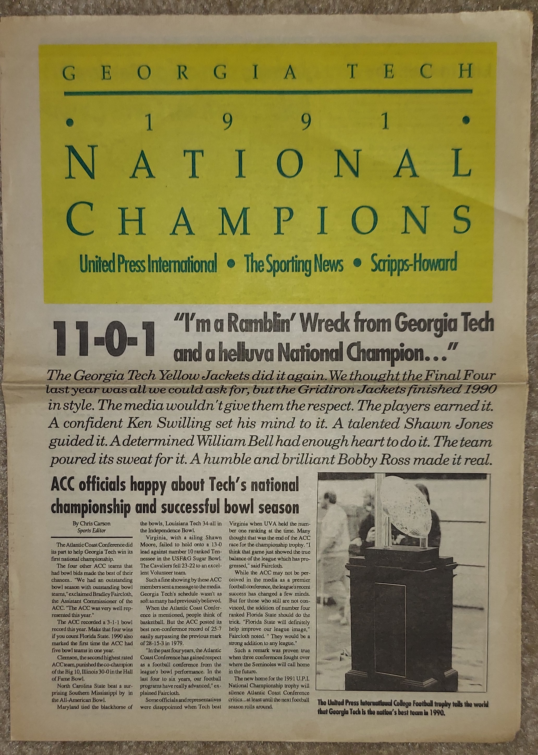 Tech's athletics program was strong beyond basketball as well: my matriculation overlapped with that of future World #1 golfer David Duval and future Boston Red Sox legends Nomar Garciaparra and Jason Varitek. Marco Coleman (who I didn't know personally, but lived down the hall from me) had a long NFL career and is now Georgia Tech's defensive line coach. Because I was usually in New Orleans in the Fall, I only saw a handful of football games in person, but in Fall '90 I was glued to the TV as the Jackets beat #1 Virginia on a late FG, finished the season undefeated, then blew out Nebraska in the Citrus Bowl to earn a national championship.