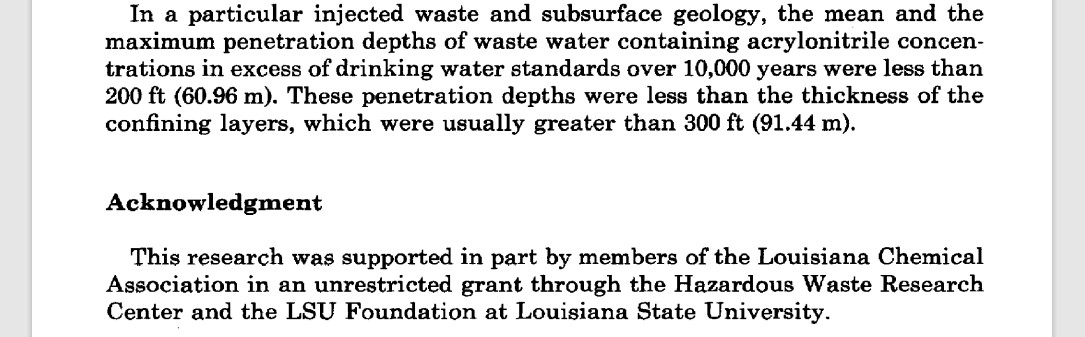 There was another source of angst - the plant stirred controversy by disposing of waste products via "deep-well injection" (pumping it underground); the Tulane Environmental Law Clinic was not a fan. I recently searched for scholarship about this practice and turned up "Stochastic modeling of flow and transport in deep-well injection disposal systems" from the August 1993 edition of the Journal of Hazardous Materials (the source of the attached image). The study suggests that Cyanamid's use of deep-well injection was safe; hopefully the model is accurate!