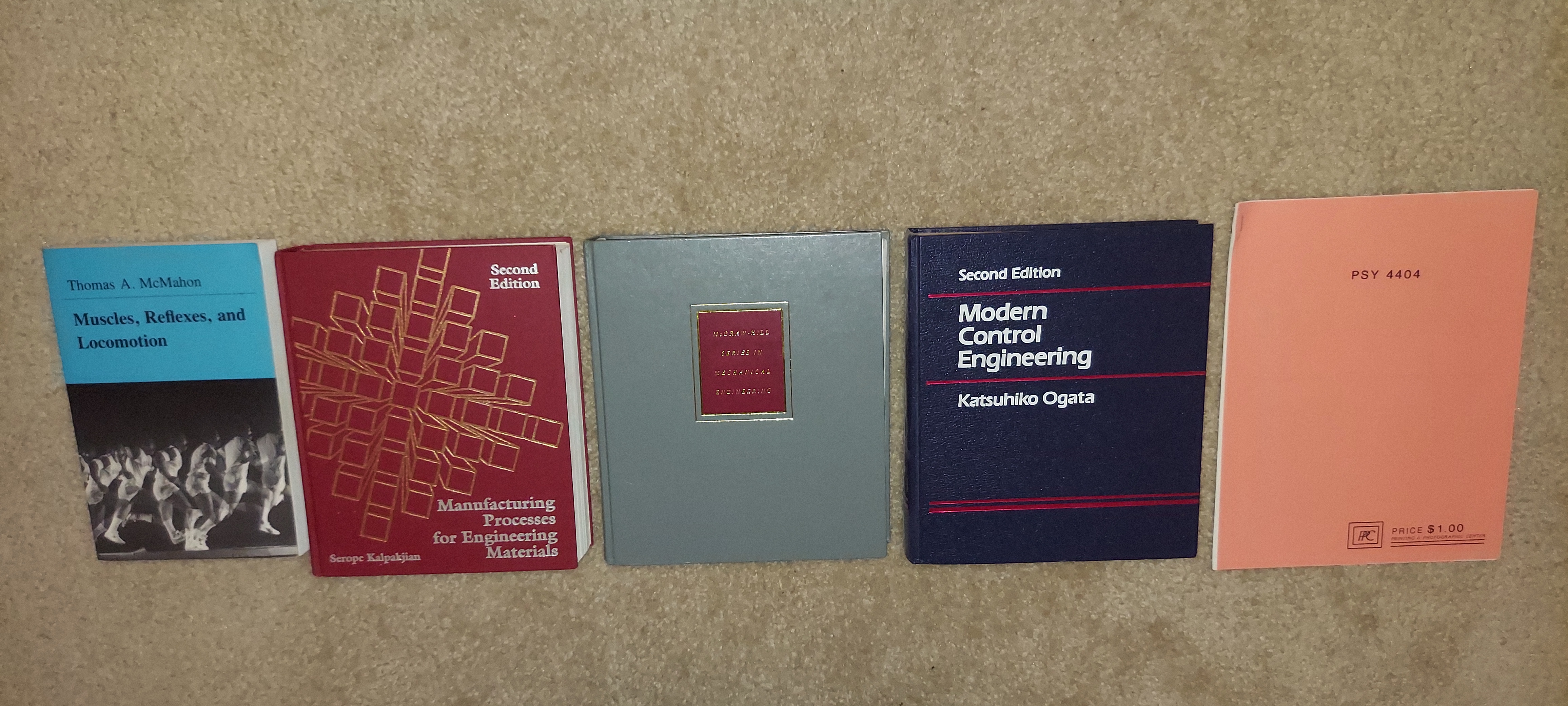 Below are my books for Biomechanics, Manufacturing Engineering & Technology, Mechanical Engineering Design II, Automatic Controls, and Psychology of Advertising. It was kind of awkward when I asked my Biomechanics professor for a reference letter to accompany my application to study biomechanics in grad school... at UT-Austin. Per his brash and humorous mien, the prof's knee-jerk response was "Why would you want to do that?!" It was a good question - Georgia Tech had/has a strong bioengineering program. I was ready for a change of scenery, though. I wasn't particularly enamored of Atlanta, and moving to Austin meant I'd be with my brother Tim (who was a sophomore at UT) and my Aunt Elaine (an Austin resident since the early '70s). I got my recommendation letter and sent it to UT, along with my impressive transcript and high Graduate Record Examination score - I took a (then-novel) computer-based version of the GRE; no #2 pencil required.