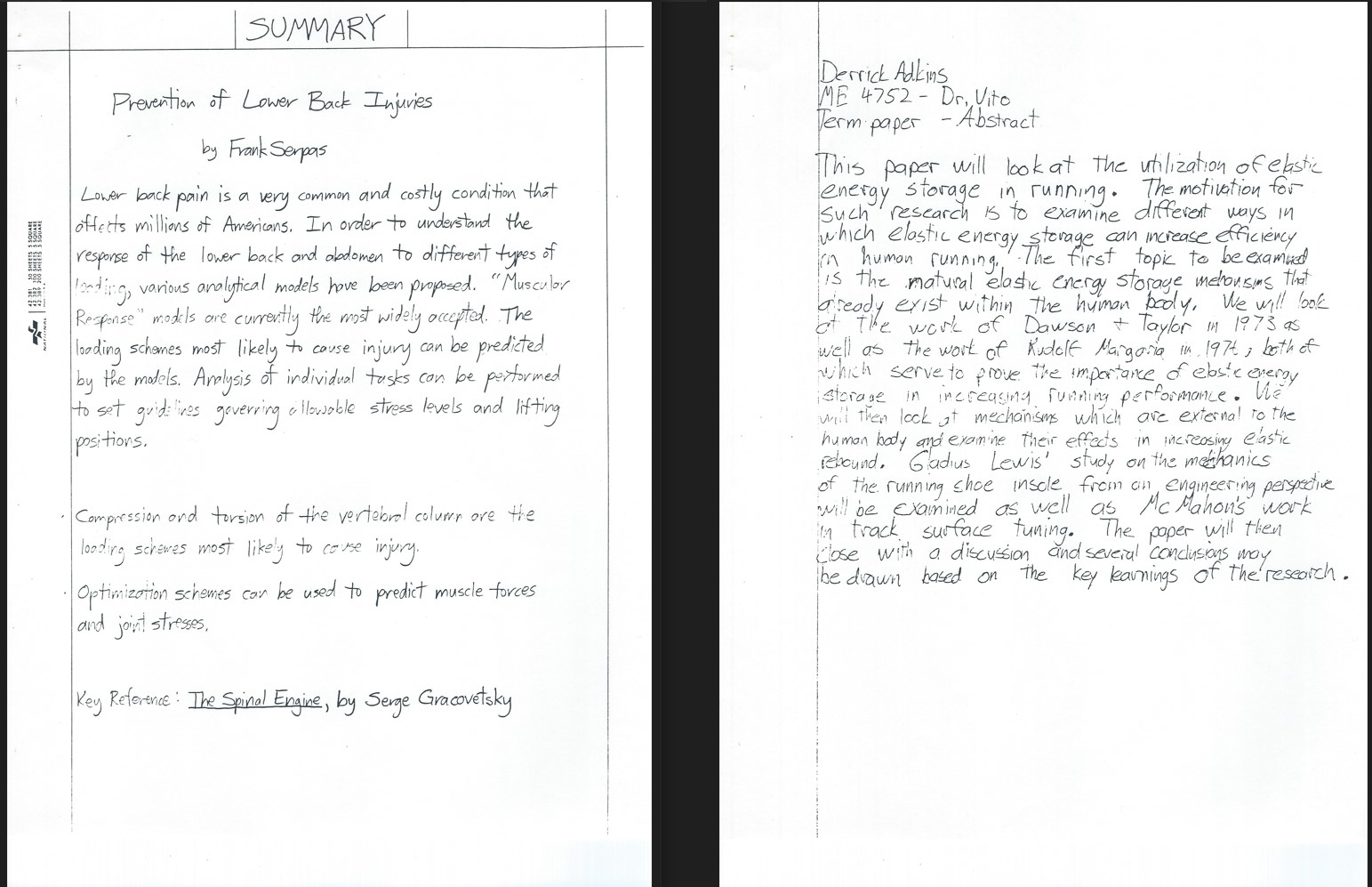 While I was proficient in the conceptual underpinnings of biomechanics, I was less comfortable with applying that knowledge in the real world. Someone who ably bridged theory and practice was a classmate of mine: Derrick Adkins, a member of Georgia Tech's track team (the image below shows my abstract and his abstract from our individual term-paper projects in Biomechanics). I didn't know him personally, but it was thrilling to watch the live broadcast of his gold-medal win in the 400-meter hurdles at the '96 Summer Olympics. He later coached track & field at Columbia University, but it's not a storybook ending - Googling indicates that he has been forthright about struggling with depression, possibly related to head injuries sustained while training: