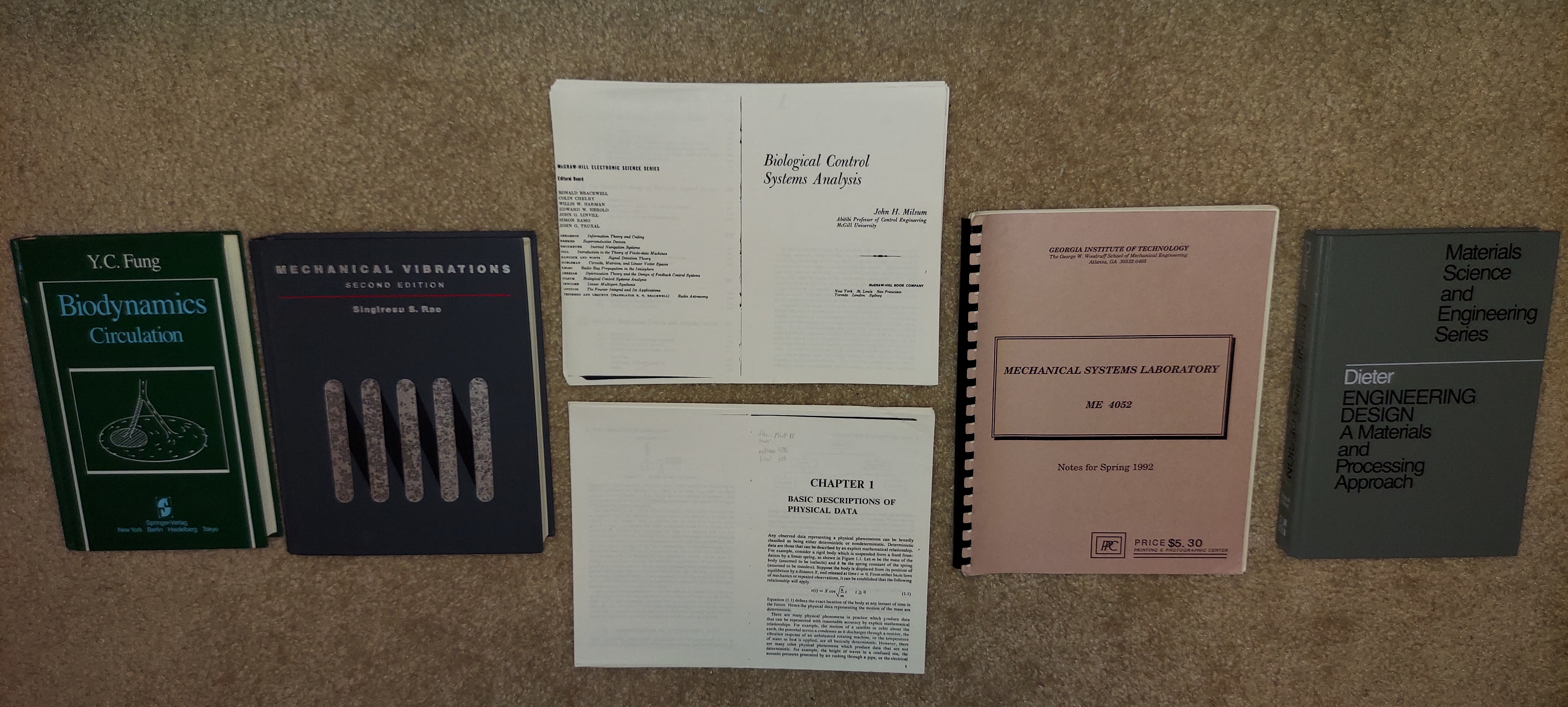 Below are my texts for Introduction to Biofluid Dynamics, Structural Vibrations, Biosystems Analysis, Mechanical Systems Laboratory, and Mechanical Design Engineering. A big component of the Biofluids class was a research paper and related oral presentation. The person I was partnered with had a public speaking phobia, so he volunteered to do the paper if I would do the presentation. Though I'm normally reluctant to cede control, I took the deal so that I could focus energy on my other classes. It sort of worked - the paper ("The Role of Wall Stress in Atherogenesis") was well-written, and my presentation was competent, but during the Q&A the professor (Dr. Bob Nerem, a titan in the field of bioengineering) detected my lack of familiarity with the material, and seemed distinctly unimpressed with me.