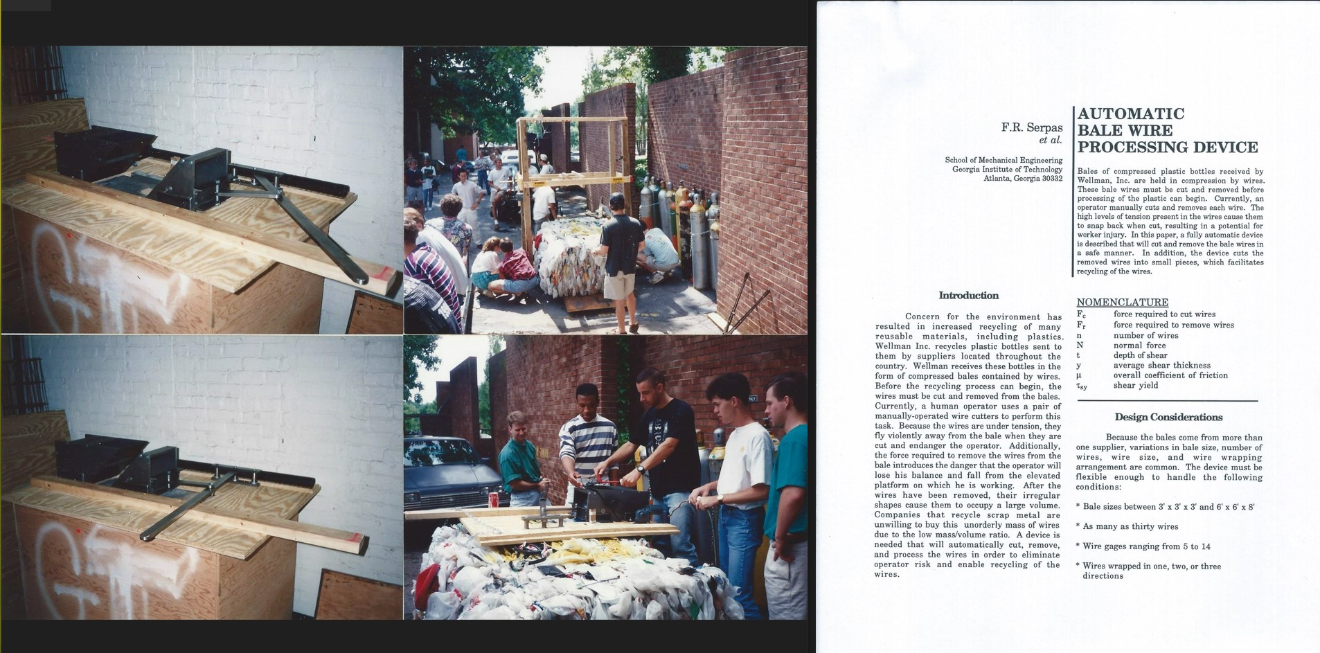 Mechanical Design Engineering was the capstone design project class, in which teams attack a real-world problem submitted by a company. Each team had the same task: designing a means of removing baling wires from cuboids comprising compacted to-be-recycled plastic bottles. The image below contains pictures of our prototype and its use (by my teammates David, Levi, Chris, John, and Courtney) on the day when the teams' designs were put to the test. We didn't build the linkage containing the reciprocating cutting apparatus, but the angled headstock and complementary ram (here actuated by a mechanical lever instead of a hydraulic cylinder) worked as designed - the cut wires were grabbed and removed by a pair of rollers (one in the headstock, one in the ram).