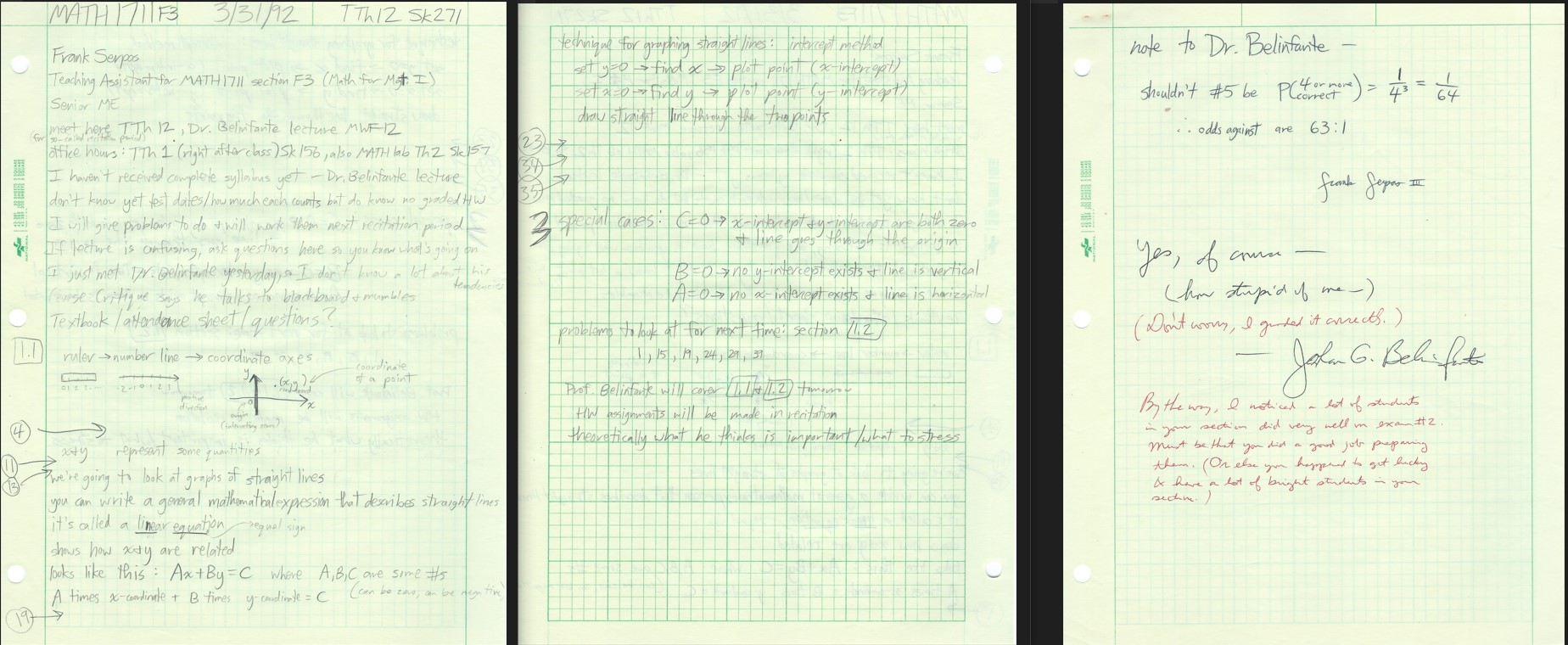 This quarter's teaching assistant assignment was in a different subject: Mathematics for Management I, which was geared toward Tech's relatively-small population of non-engineering students (mostly Architecture and Management majors). Here we see the lesson plan I wrote regarding what to cover during the first class session (held on my 22nd birthday), along with a piece of correspondence with the course's professor. Throughout my three quarters as a TA, I took my teaching responsibilities seriously; that experience prepared me well for my future teaching role during grad school, and I'm confident that my students benefited from my pedagogical effort. Even so, the difficulty of the material meant that my efforts could only go so far: while the grade distribution for this class wasn't bad (1 drop, 4 F, 2 D, 6 C, 9 B, 10 A), the totals for the two Calculus II classes I taught were brutal (4 drop, 8 F, 15 D, 31 C, 10 B, 5 A).