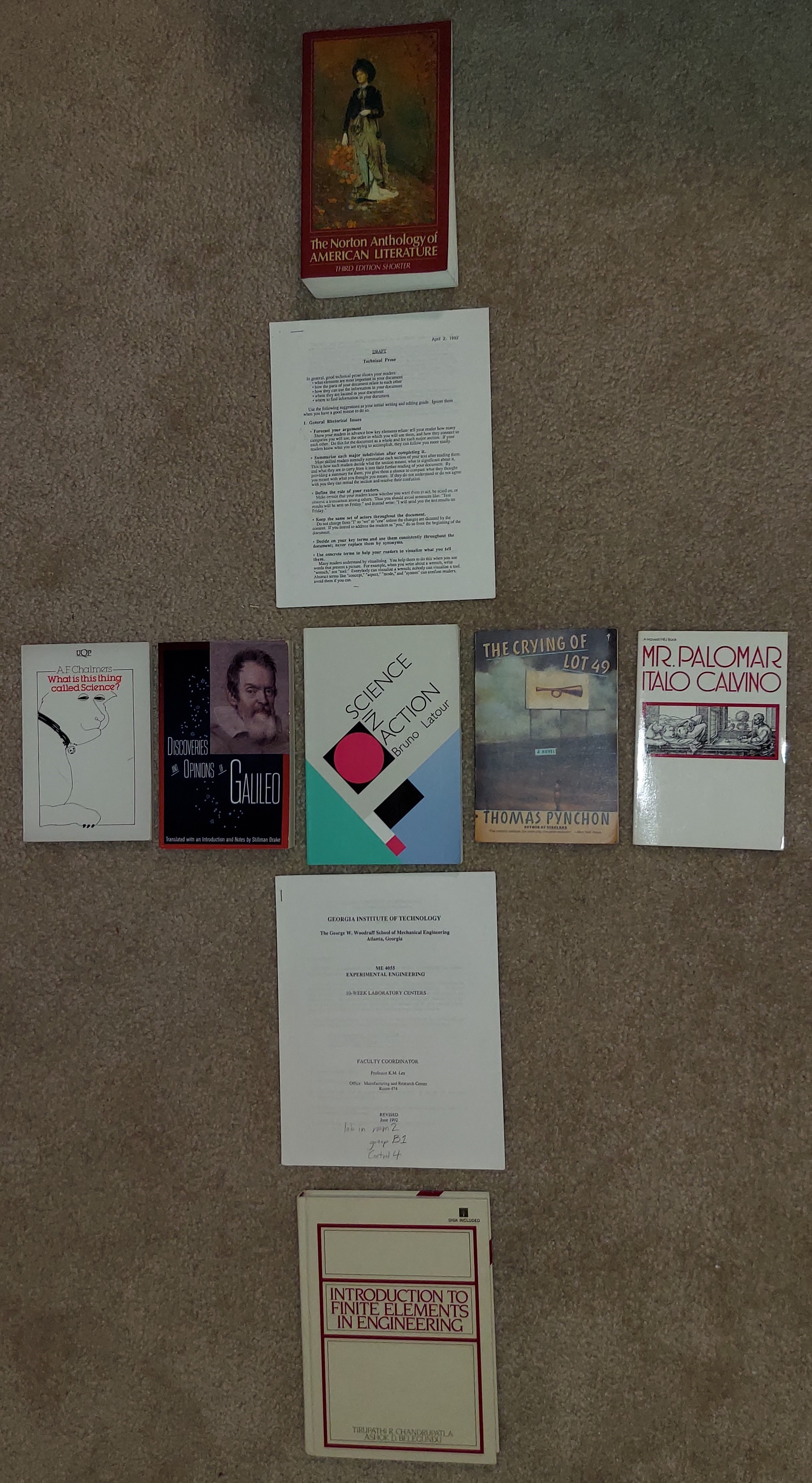 Here are my texts for Survey of American Literature, Technical Writing, Introduction to Science, Technology, and Culture, Experimental Engineering, and Interactive Computer Graphics & Computer Aided Design. During my undergraduate years, I didn't take any English classes until my final quarter - I tested out of freshman English, and Tech didn't require many credit hours in the humanities (it was mostly all-STEM, all-the-time). So, in my academic finale I finally got to stretch my brain by writing papers like "Man's Relationship with Nature in American Literature" and "Modalities in Popular Science News" (in addition to more typical fare like "Tactile Feedback Part Identification via One Degree of Freedom Telerobotic Arm").