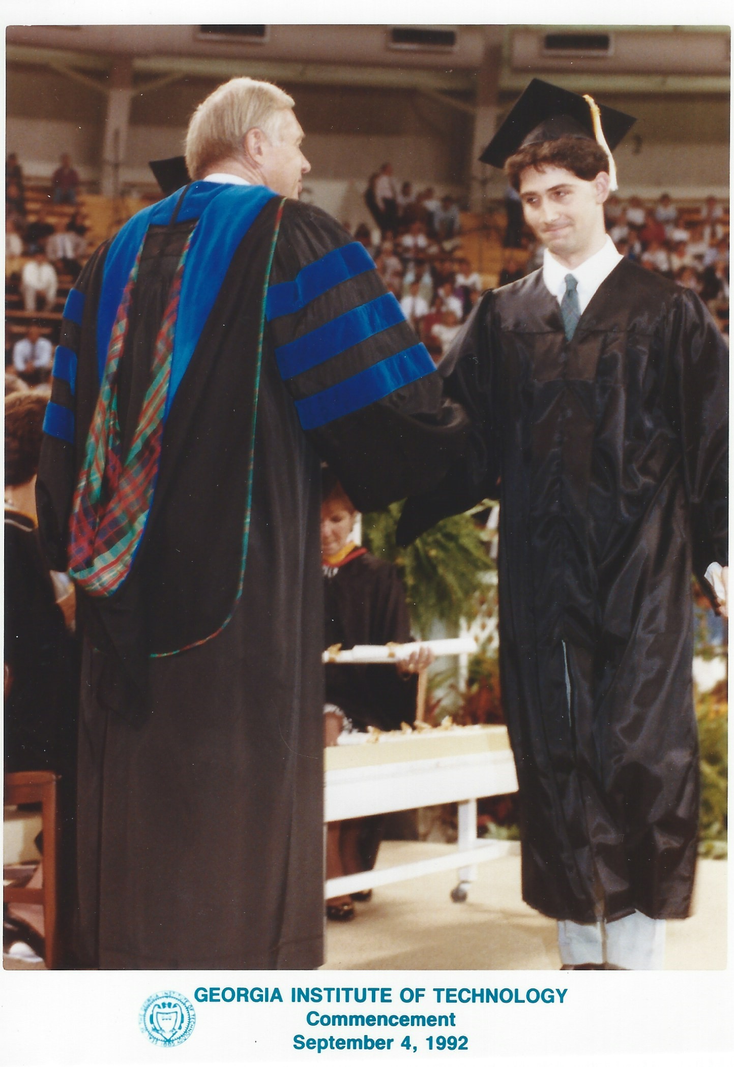 Here I am getting my Bachelor of Mechanical Engineering diploma from Georgia Tech President Pat Crecine. I'm not sure what to make of the knowing look I'm evincing; maybe "Heh, Darren told me stories about you."