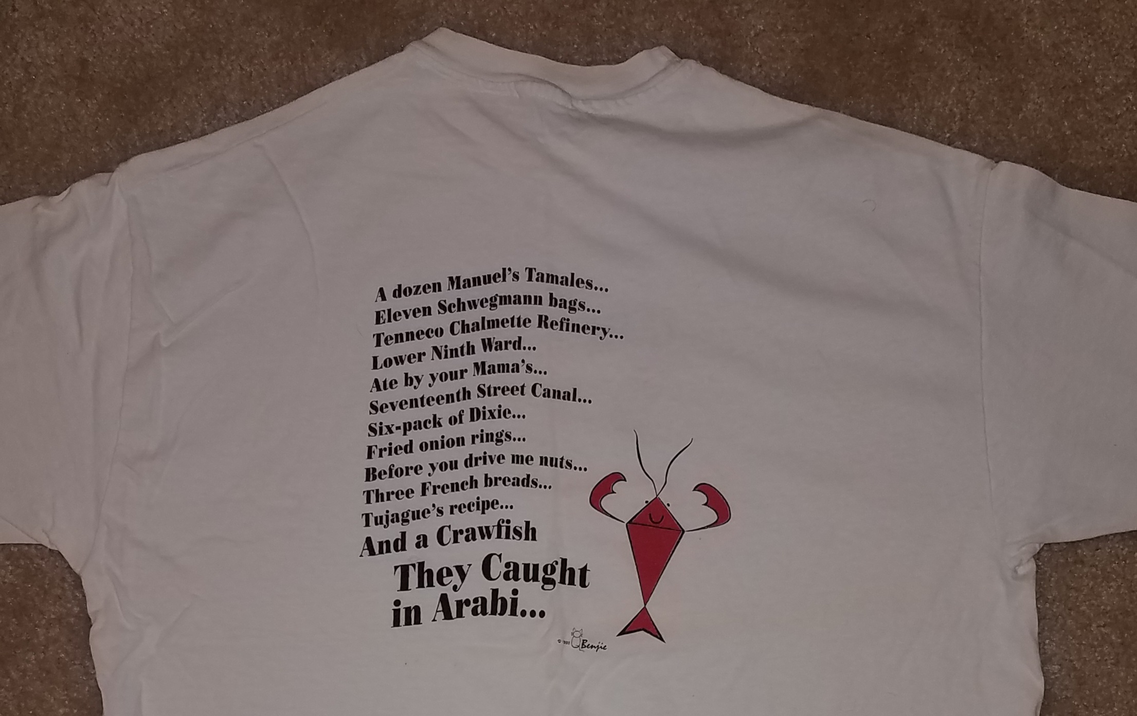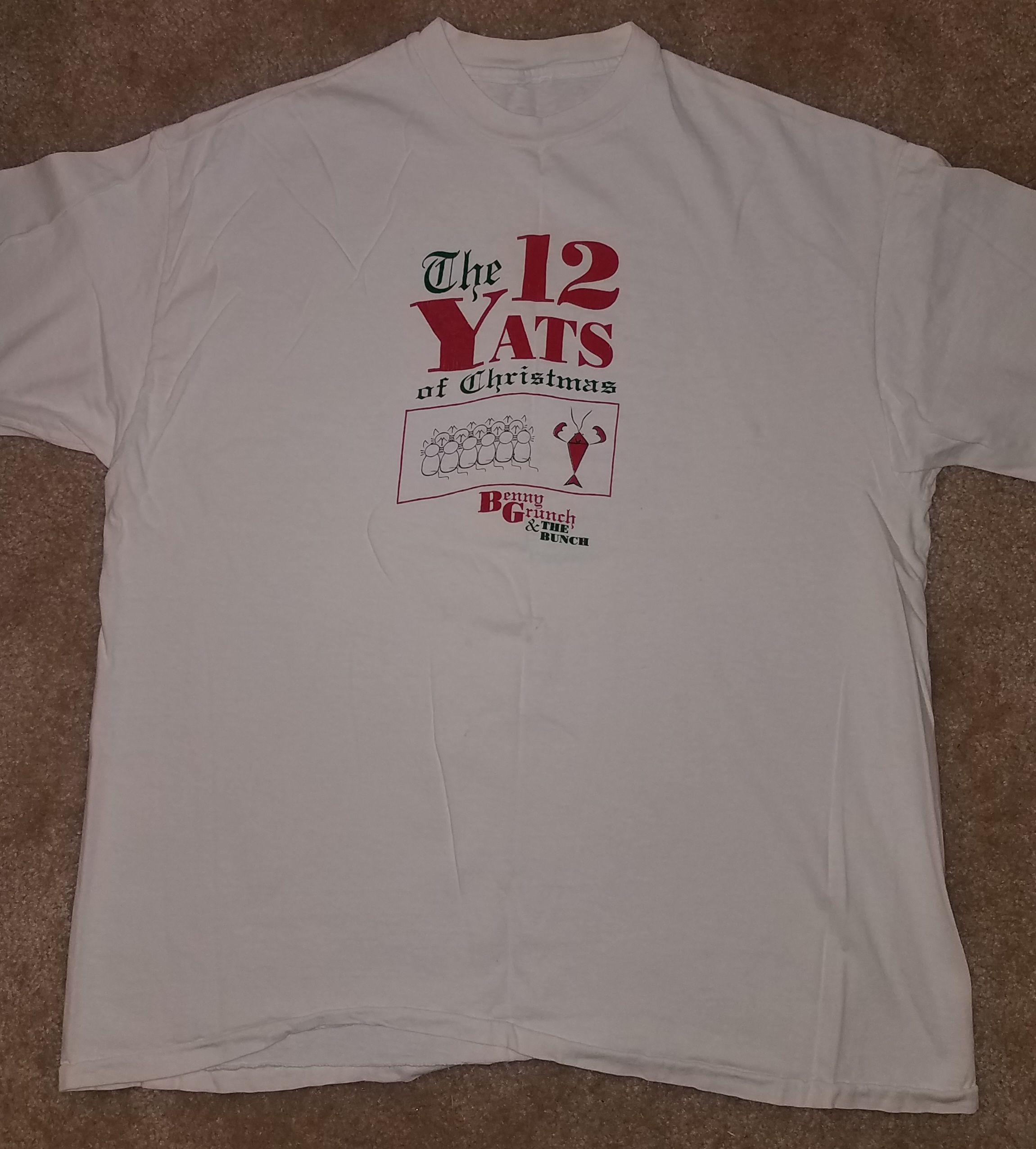 No, it's not too late for a Christmas shirt! People from New Orleans (like me) know that the twelve days of Christmas are happening right now, counting down to that most holy event: the start of King Cake season. "The 12 Yats Of Christmas" is a beloved Crescent City holiday classic inspired by the traditional cumulative carol, featuring my Aunt Becky as Seven(teenth Street Canal) and her longtime partner Benny Grunch as most of the rest of the days. My own accent is not very Yatty, however; I'm told that I sound Canadian.